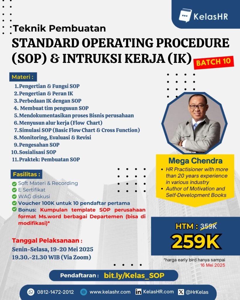 Dengan mengikuti Workshop Teknik Pembuatan SOP & Instruksi Kerja, Anda akan menjadi aset berharga bagi perusahaan dengan kemampuan untuk menyusun dan menjaga SOP yang efektif, memastikan standar kerja yang jelas dan terstruktur. Selain itu, Anda juga akan mampu membuat Instruksi Kerja yang detail dan aplikatif, sehingga setiap tugas dapat dijalankan dengan benar, konsisten, dan sesuai standar. Dengan adanya SOP dan Instruksi Kerja yang tepat, operasional perusahaan akan lebih optimal, kesalahan dapat diminimalisir, dan efisiensi kerja meningkat. Pada akhirnya, sistem yang solid ini akan membantu perusahaan mencapai tujuan bisnis lebih cepat dengan tim yang bekerja lebih terarah dan produktif.