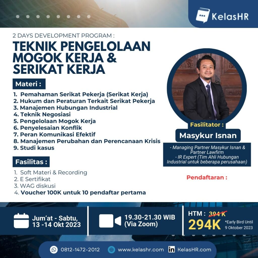 Dalam dunia industri, kemampuan untuk mengelola hubungan antara perusahaan dan Serikat Pekerja adalah kunci untuk keberlanjutan dan produktivitas. Program webinar kali ini dirancang untuk membekali Anda dengan keterampilan dan pengetahuan yang diperlukan untuk menghadapi dan menyelesaikan berbagai tantangan dalam hubungan industrial, terkhusus workshop ini membahas utas perihal penanganan karyawan yang mogok kerja dan penanganan yang tepat menghadapi serikat pekerja.