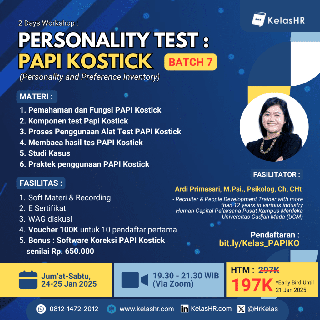 Apakah Anda ingin mengambil langkah lebih maju dalam proses rekrutmen? Kami mempersembahkan “2 Days Workshop Personality Test PAPI Kostick” yang akan membuka pintu rahasia untuk memahami kandidat Anda dengan lebih mendalam.