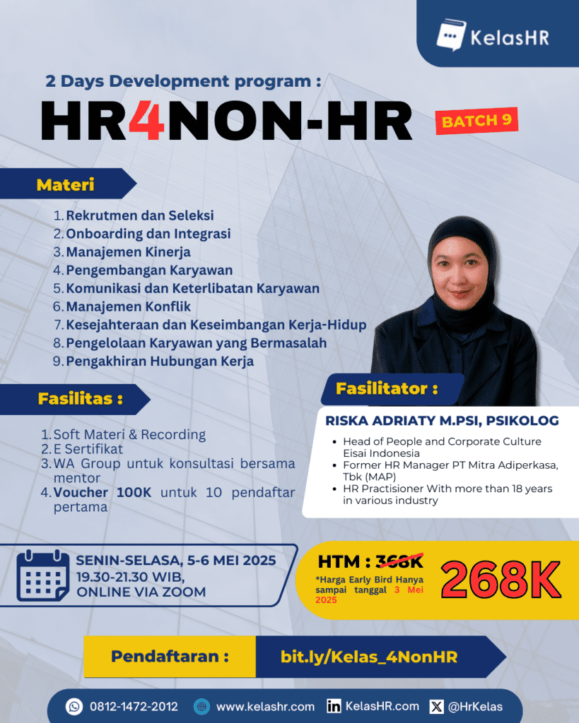 Riska Adriaty, M.Psi., Psikolog, adalah seorang profesional sumber daya manusia dengan pengalaman lebih dari 18 tahun di berbagai industri. Saat ini, beliau menjabat sebagai Head of People and Corporate Culture di Eisai Indonesia, sebuah perusahaan farmasi global yang berfokus pada kesehatan manusia. Sebelumnya, Riska pernah menjabat sebagai HR Manager di PT Mitra Adiperkasa, Tbk (MAP), perusahaan ritel terkemuka di Indonesia.