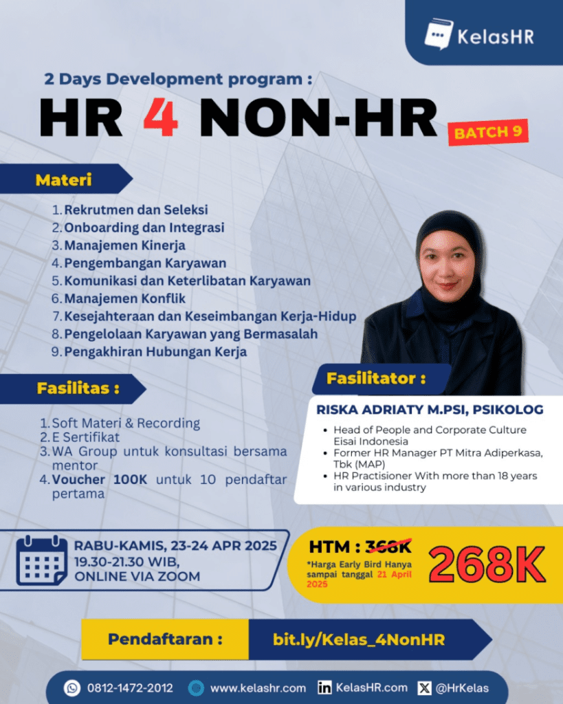 Riska Adriaty, M.Psi., Psikolog, adalah seorang profesional sumber daya manusia dengan pengalaman lebih dari 18 tahun di berbagai industri. Saat ini, beliau menjabat sebagai Head of People and Corporate Culture di Eisai Indonesia, sebuah perusahaan farmasi global yang berfokus pada kesehatan manusia. Sebelumnya, Riska pernah menjabat sebagai HR Manager di PT Mitra Adiperkasa, Tbk (MAP), perusahaan ritel terkemuka di Indonesia.