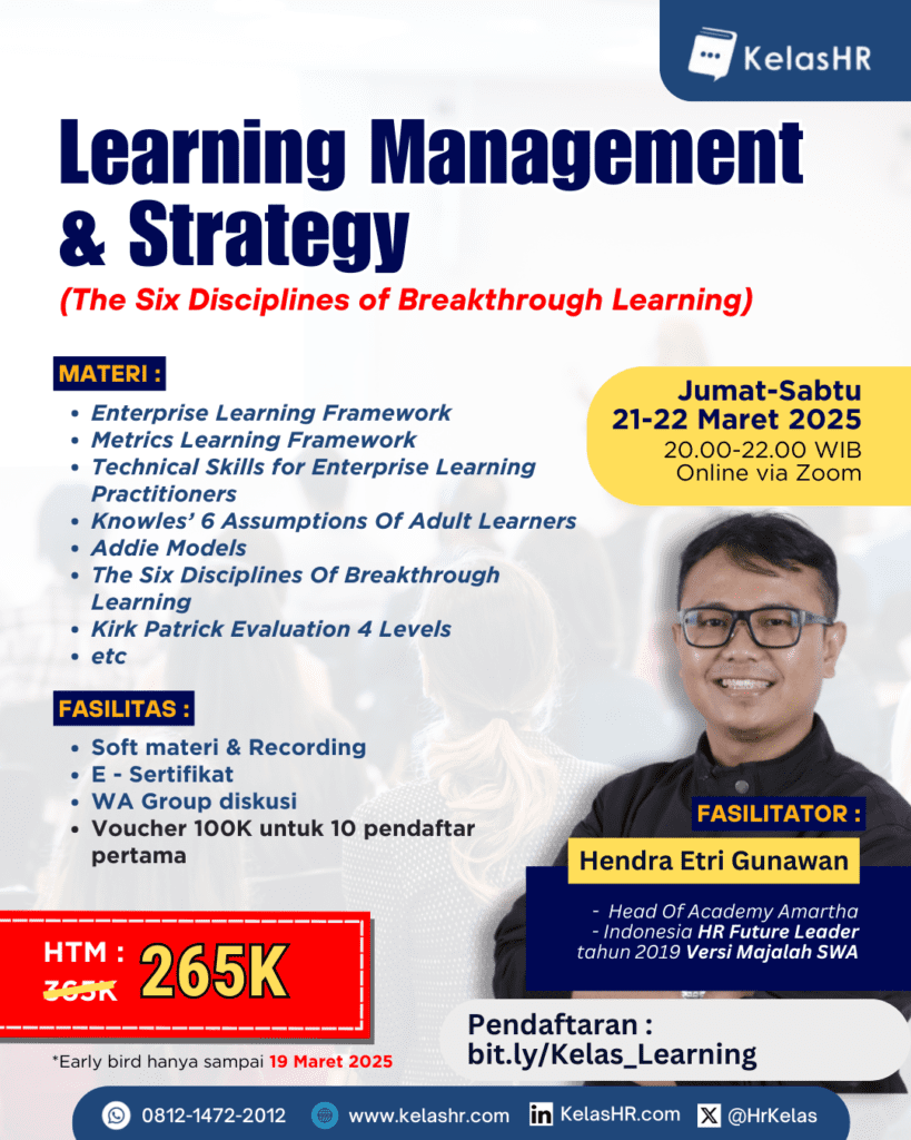 🔹 Enterprise Learning Framework – Cara menyusun strategi pembelajaran yang efektif untuk organisasi. 🔹Metrics Learning Framework – Mengukur efektivitas pelatihan dengan data yang jelas dan akurat. 🔹Technical Skills for Enterprise Learning Practitioners – Keahlian teknis yang diperlukan untuk HR dalam mendukung pembelajaran karyawan. 🔹 Knowles’ 6 Assumptions of Adult Learners – Memahami cara belajar orang dewasa agar materi lebih mudah dipahami dan diterapkan. 🔹 ADDIE Model – Model desain instruksional untuk mengembangkan program pelatihan yang efektif. 🔹 The Six Disciplines Of Breakthrough Learning – Framework utama dalam memastikan transfer pembelajaran berjalan dengan sukses. 🔹 Kirk Patrick Evaluation 4 Levels – Teknik evaluasi untuk memastikan pelatihan memberikan hasil nyata bagi bisnis.