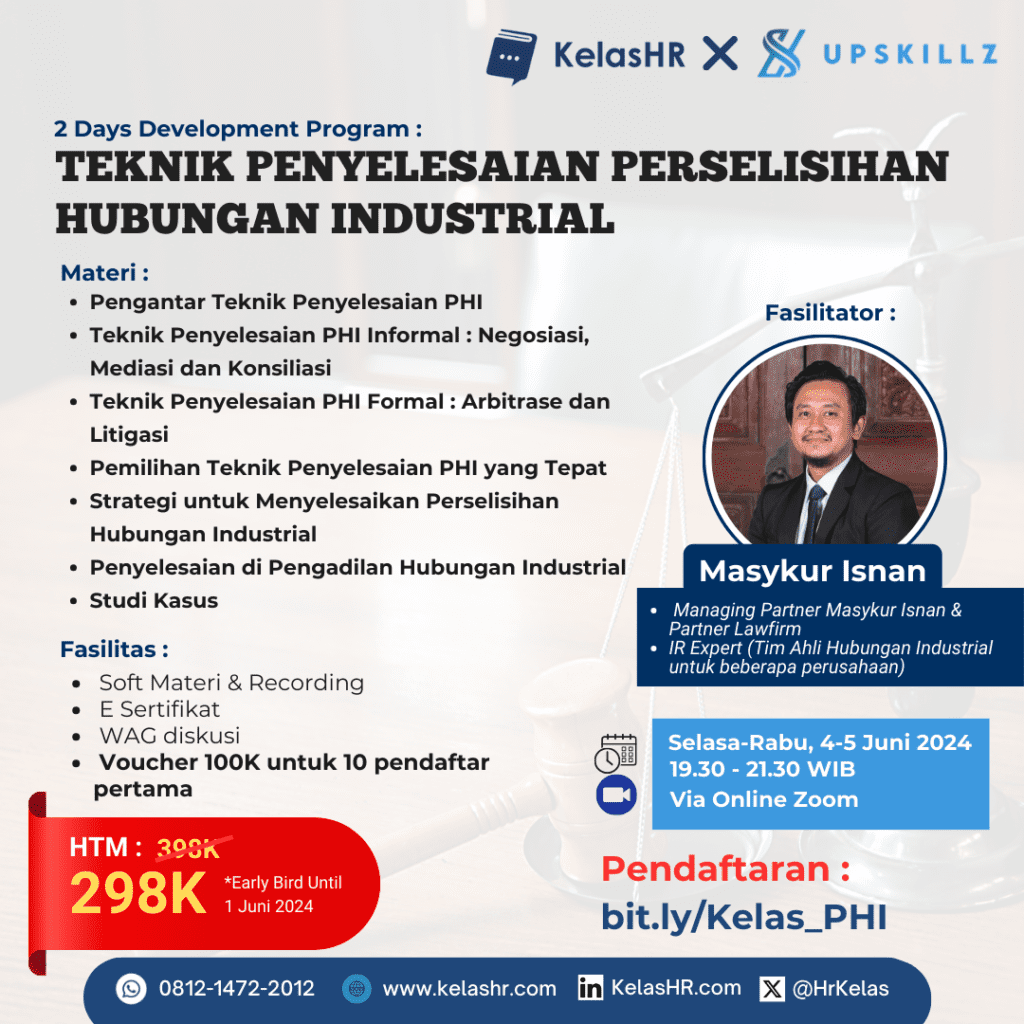 Menguasai Wawasan terkait dengan “Perselisihan Hubungan Industrial” sangat penting karena perselisihan dalam hubungan industrial adalah hal yang tak terhindarkan di lingkungan kerja. Ketidakmampuan dalam menangani perselisihan ini dapat menyebabkan dampak negatif yang signifikan seperti penurunan produktivitas, peningkatan biaya hukum, dan terganggunya hubungan kerja yang harmonis. Dengan mengikuti kegiatan ini, Anda akan mempelajari strategi dan teknik efektif untuk menyelesaikan konflik secara profesional dan efisien. Keterampilan ini tidak hanya membantu mengurangi risiko litigasi dan biaya terkait, tetapi juga menciptakan lingkungan kerja yang stabil dan produktif. Selain itu, pemahaman yang mendalam tentang penyelesaian perselisihan dapat meningkatkan reputasi perusahaan sebagai tempat kerja yang adil dan harmonis, yang pada akhirnya akan menarik dan mempertahankan talenta terbaik.
