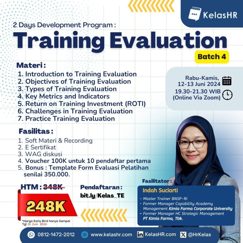 Program “2 Days Development Program: Training Evaluation” ini adalah solusi khusus yang dirancang untuk membantu Anda mengatasi tantangan dalam melaksanakan Training Evaluation. Program ini akan memberikan Anda pengetahuan dan pemahaman tentang berbagai aspek penting dari Training Evaluation, termasuk pengenalan terhadap Training Evaluation, tujuan dari Training Evaluation, jenis-jenis Training Evaluation, metrik dan indikator kunci, pengembalian investasi pelatihan (ROTI), tantangan dalam Training Evaluation, dan praktek Training Evaluation.